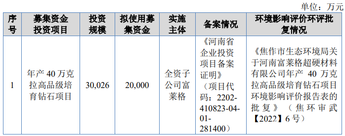 公司本次發行募集資金扣除發行費用後,擬全部用於年產40萬克拉高品級培育鑽石項目,擬使用募集資金2億元。