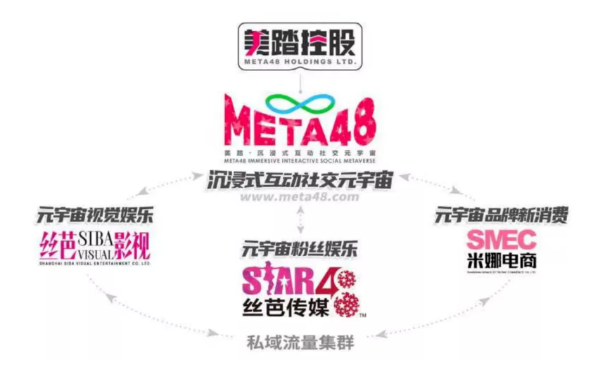 6月10日,絲芭傳媒官宣,公司業務與企業架構將重組,其控股公司更名為美踏控股,核心業務將轉型為面向WEB3.0和XR互聯網時代的沉浸式互動社交元宇宙——美踏元宇宙。META48旗下核心業務共分三塊:元宇宙視覺娛樂、元宇宙粉絲娛樂與元宇宙品牌新消費,分別對應着絲芭影視、絲芭傳媒與米娜電商。