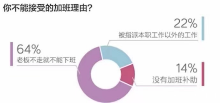 64%的90後都對“老闆不走就不能下班”的説法嗤之以鼻,認為表演式的努力就是純純混蛋笑話,下班時間後在公司多待1分鐘,都是對**“8小時工作制”**的不尊重;