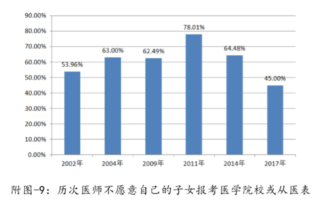 中國醫師協會發布的《2017中國醫師執業狀況白皮書》顯示,2002年至2017年,醫師不希望子女從醫比例2011年最高,達到78.01%,2017年最低時也達到45%。