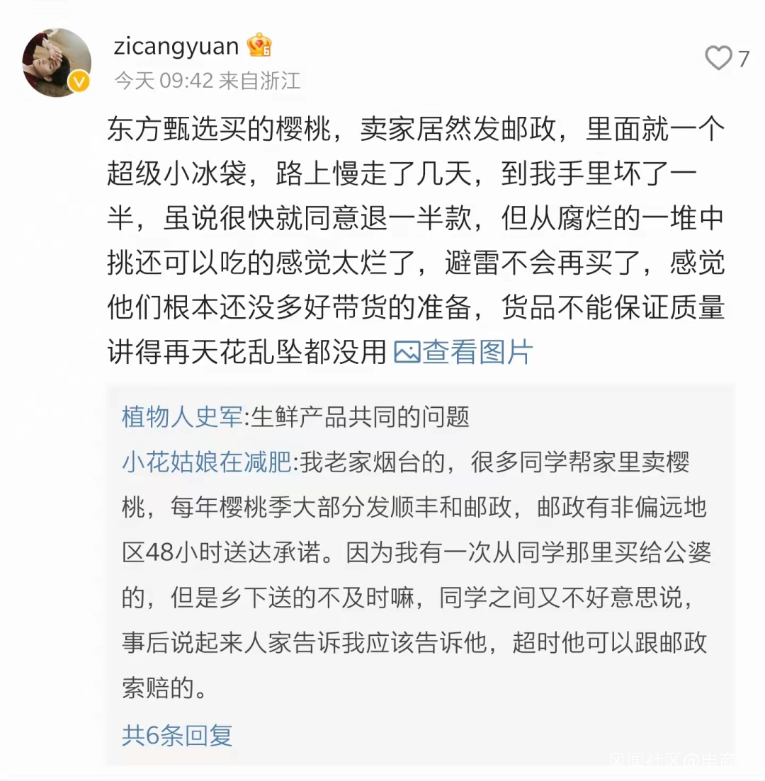 瞭解事件細節後,有網友為東方甄選打抱不平。因為6月13號桃子已經由驛站簽收,這位消費者15號才去取貨,實在有些晚了。況且東方甄選收到投訴後已為其全額退款,無可厚非。