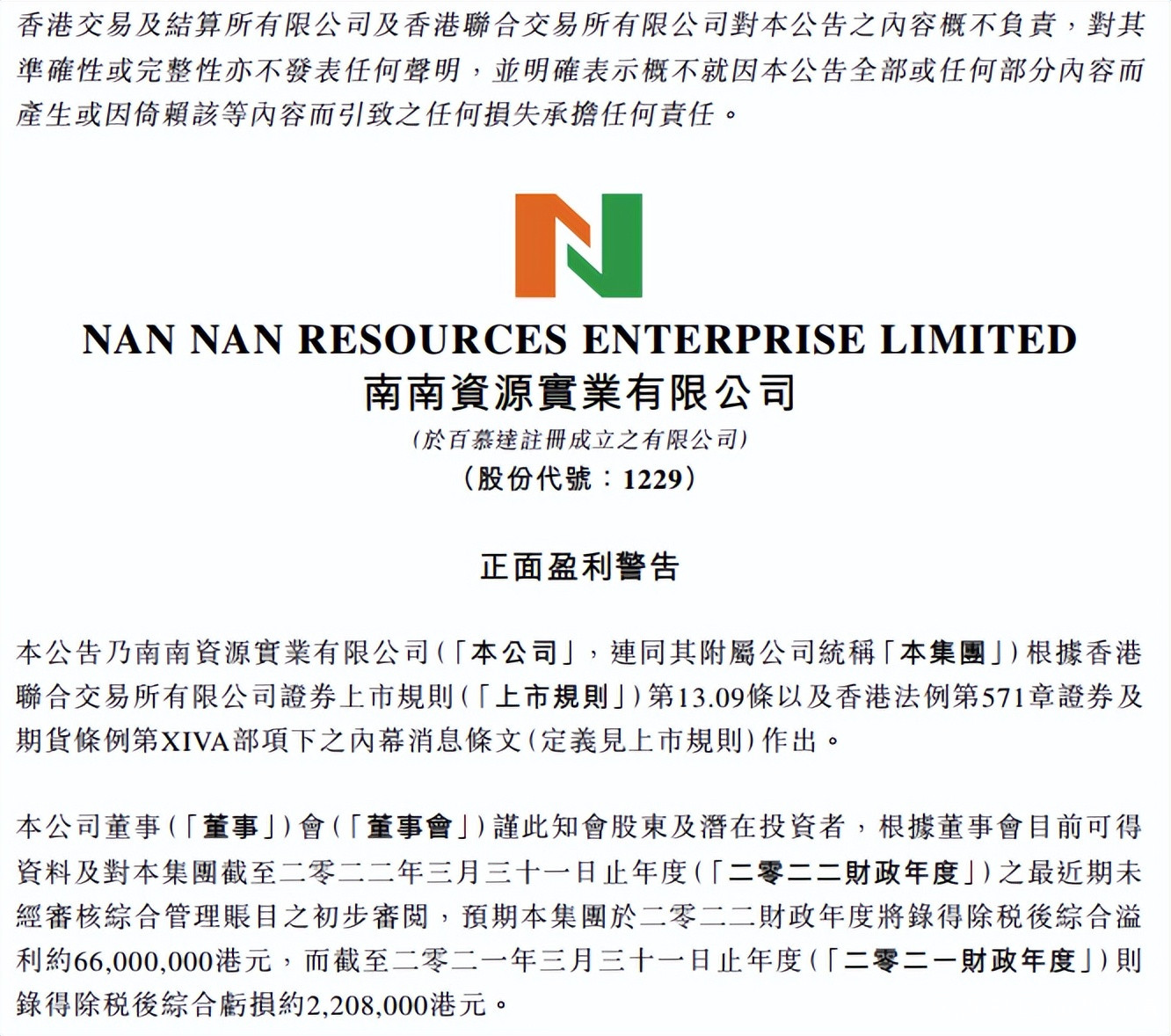 南南資源暴漲的原因來自一則財報公告。6月20日晚間,南南資源發佈2022財政年度年報業績預告。報告顯示,截至2022年3月31日止,歸屬於上市公司股東的淨利潤為6600萬港元,而2021財政年度則錄得除税後綜合虧損約220.8萬港元。