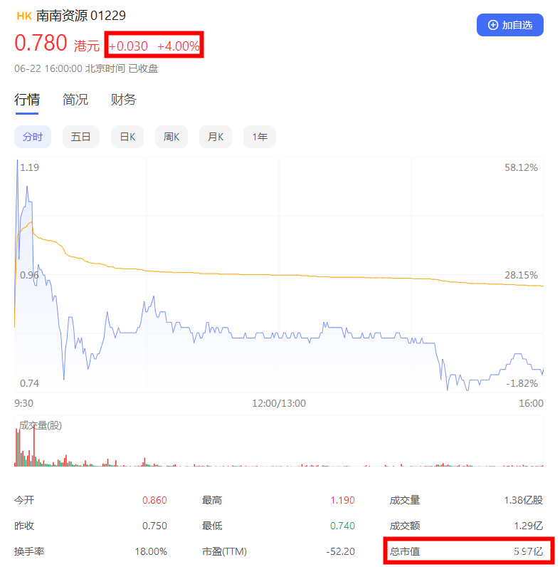 6月22日上午,港股南南資源延續漲勢,漲超50%。截至收盤,股價報收0.780港元/股,漲4.00%,總市值5.97億港元。
