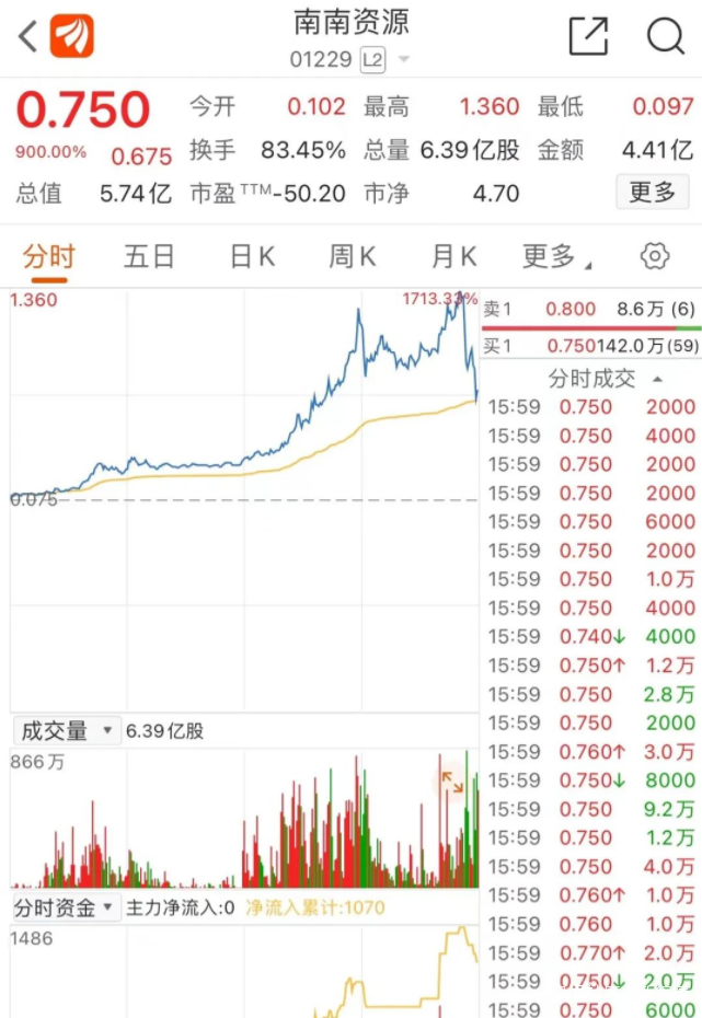 6月21日,港股又見驚人漲幅,南南資源盤中最高漲1713.33%,截至收盤漲幅回落至900%,總市值為5.74億港元。