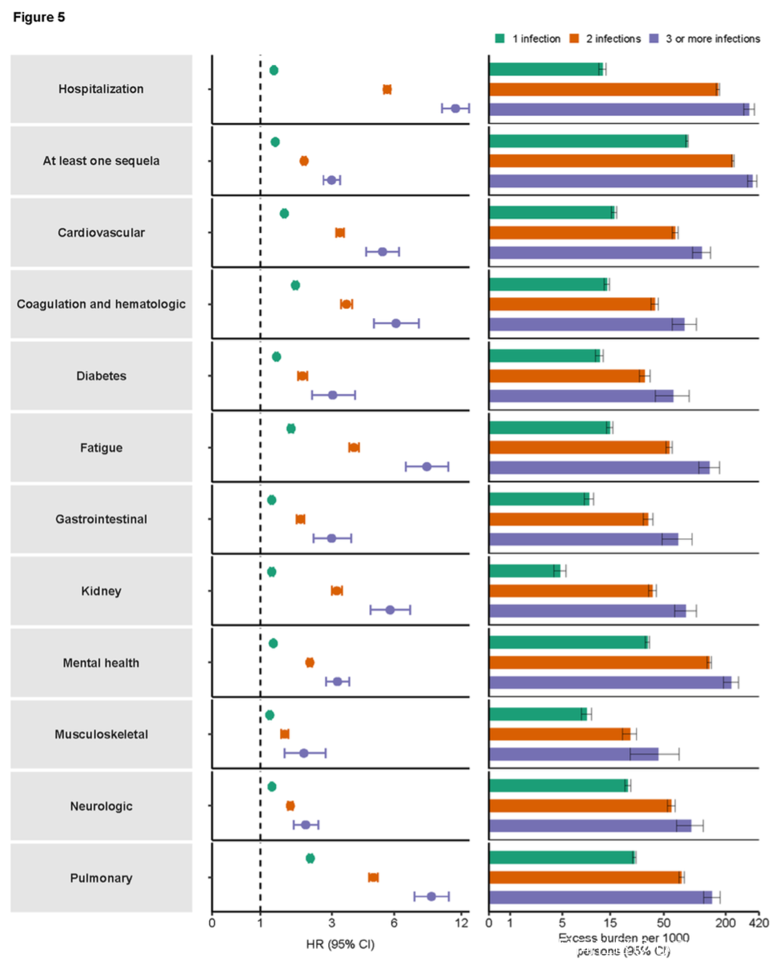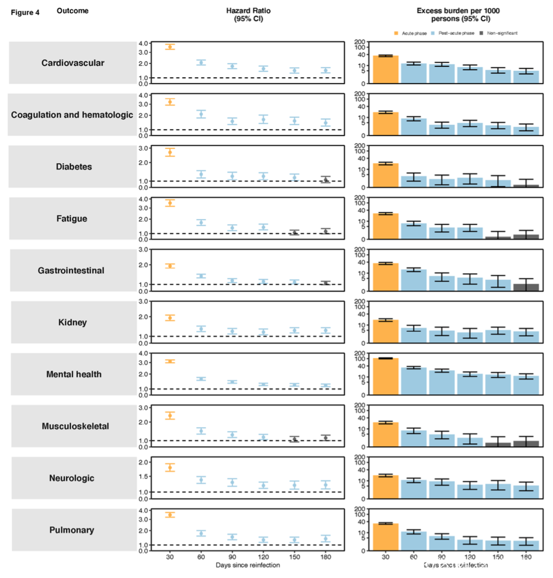 器官系統後遺症檢查表明,在急性期,所有器官系統的風險比和疾病超額負擔都增加了;疾病風險和超額負擔在再感染的急性期持續存在,大多數在再感染後6個月仍然明顯。