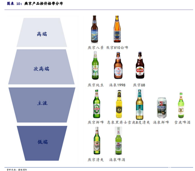 其次,燕京旗下大部分的產品定價在主流價(3-5元)與次高端(5-8元)價格帶。在高端價格帶(8 元以上)雖有一些產品佈局(比如燕京八景、桂花拉格等),但整體產品力都比較弱。