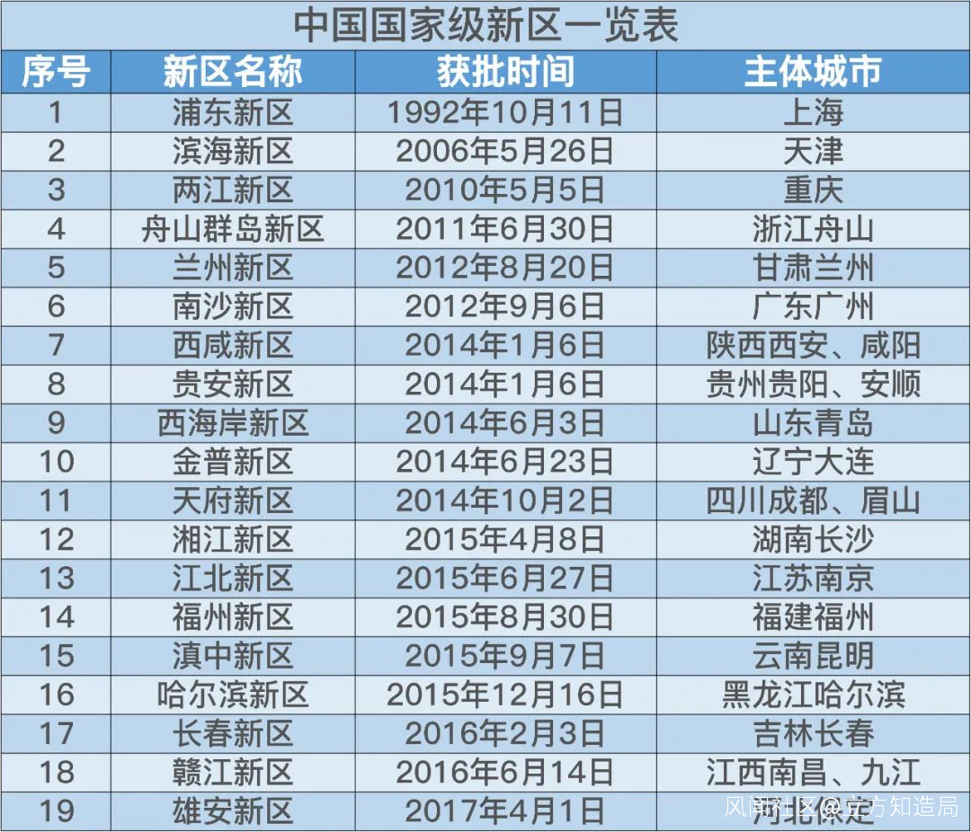 國家級新區設立的目的,是承擔國家重大發展和改革開放戰略任務。目前全國共有19個國家級新區: