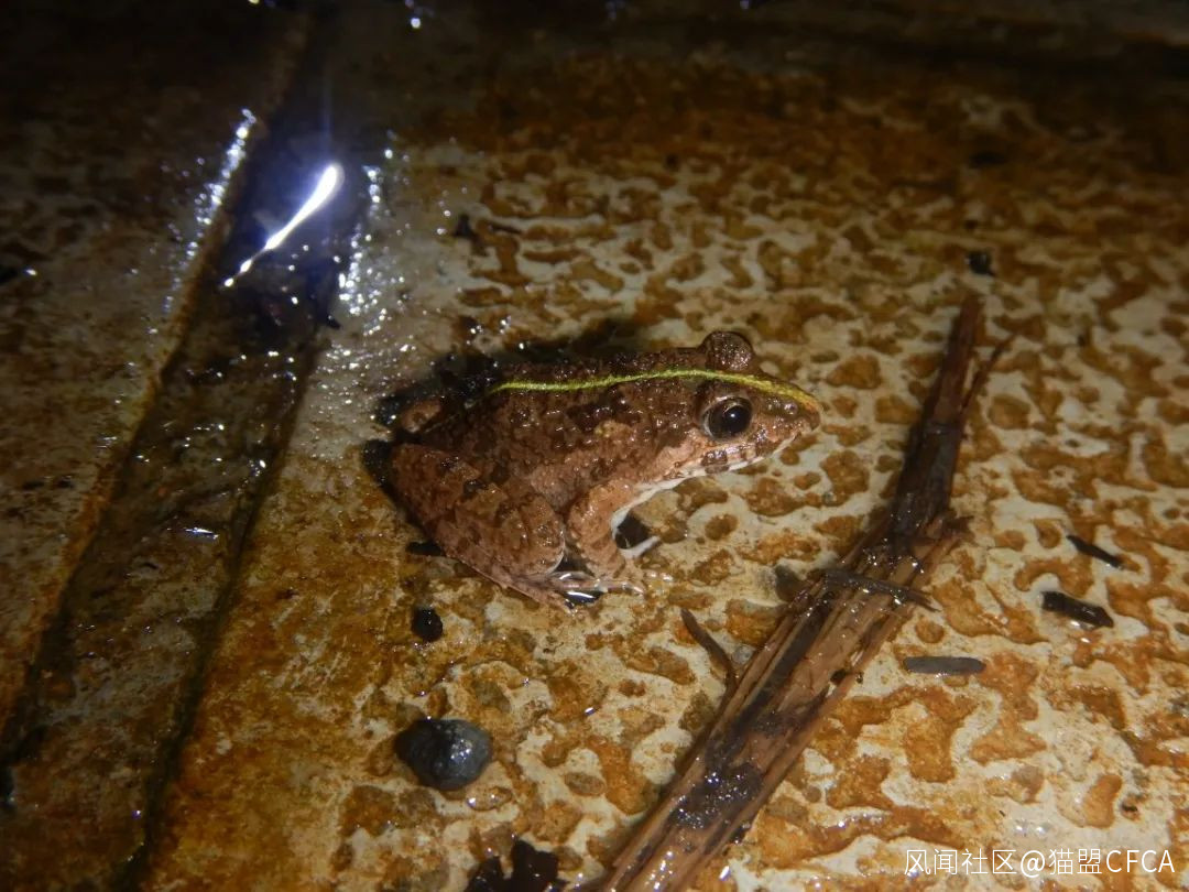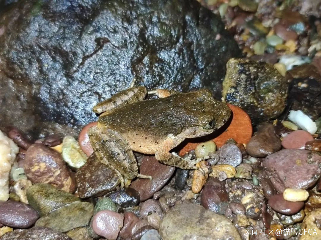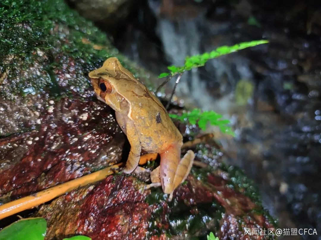 沒有湍蛙(Amolops)的勐臘,小瀑布前的岩石上蹲着一隻凹頂角蟾(Xenophrys parva) © 版納老實人