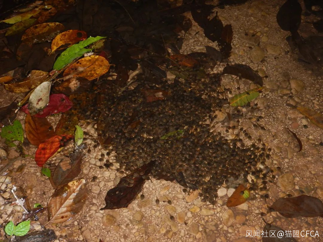 補蚌村的望天樹景區的山溪緩流處,每年冬天都有至少幾百只越南趾溝蛙(Rana johnsi)的蝌蚪聚羣,白天藏在落葉下,偶見一小部分個體暴露在外,晚上黑壓壓一片,不遺餘力地唆食溪牀沙石及落葉。它們這一時期長得簡直與飛蛙(Rhacophorus)蝌蚪一樣,但後者的幼體是不生活在溪水中的 © 版納老實人
