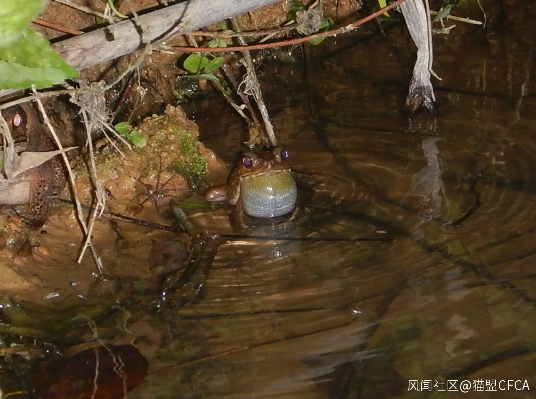 黑眶蟾蜍的鳴叫讓水面泛起漣漪,聲囊黃色的部位是他的腺體嗎?© 版納老實人