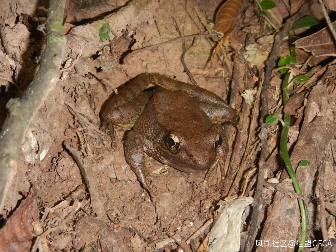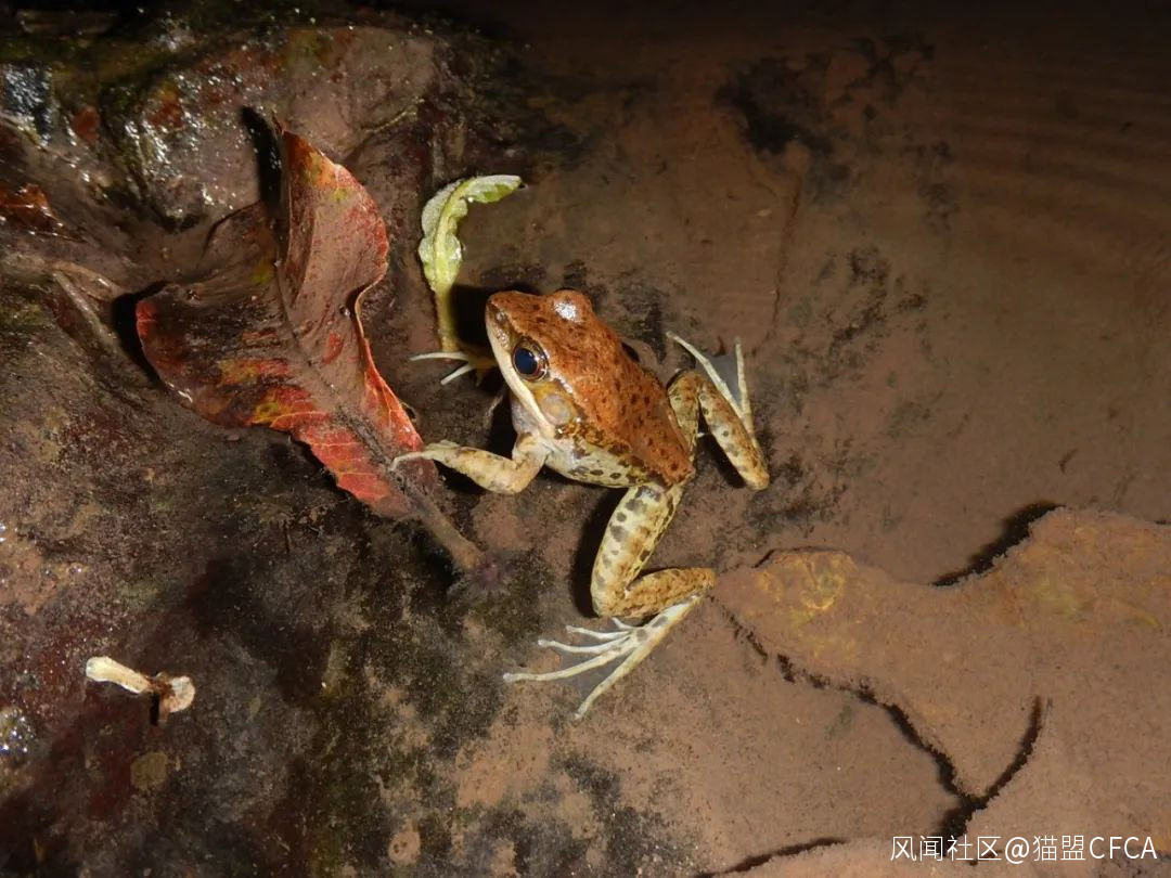 來自勐侖水庫溪流的肘腺水蛙(Sylvirana cubitalis),它沒有貫穿體側的黑帶,而背側褶細如林蛙(Rana),這一東南亞物種的記錄還很少,不知對生境有什麼樣特殊的需求 © 版納老實人