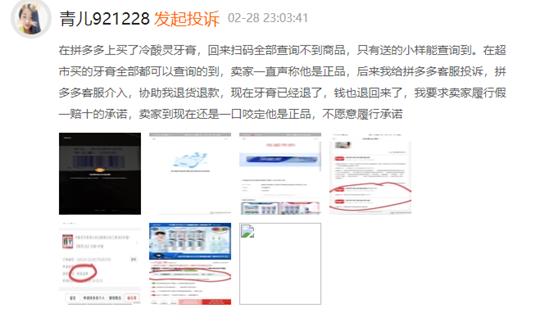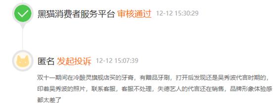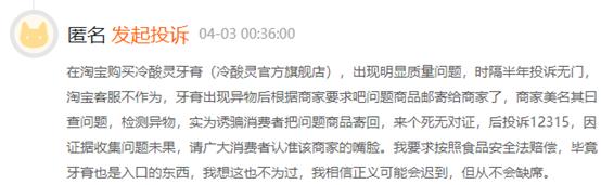 《港灣商業觀察》發現,黑貓投訴上有不少消費者對於知名單品冷酸靈進行了投訴。相關投訴主要圍繞冷酸靈這款產品,大致集中在產品品控及售後問題。有的消費者直接表示,“冷酸靈牙膏出現黑色長條異物”。