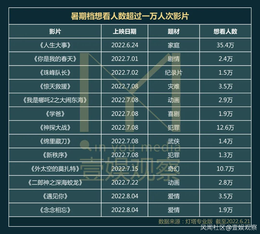 壹娛觀察整理今年暑期檔待映影片想看人數的數據,其中在燈塔專業版上超過1萬想看人數的影片有13部,超過5萬想看人數的只有《人生大事》和《外太空的莫扎特》以及剛定檔的《神探大戰》。頭部影片缺失,中腰部影片期待值有限,按照過往15億+體量影片,想看人數最低35萬+的門檻規律,今年暑期檔待映影片的整體票房勢能令人擔憂,“一超多強”的局面遠沒有成型。