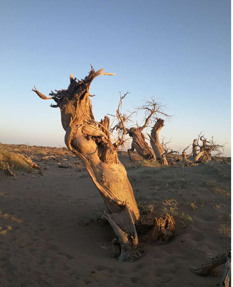 由於塔里木河下游水量減少,在若羌縣英蘇村,流沙掩埋了一座座房舍,河道里沒有一滴水,大片的胡楊林正成為沙漠上的“木乃伊”,但她仍然沒有倒下,即使默默經受了千百年的風沙侵蝕,至今依然矗立在那裏。在沙漠公路兩側,可以目睹胡楊死而不倒的身軀挺立在茫茫大漠之中,彷彿仍在同狂風作戰,又好像在向行人訴説着心酸的往事。