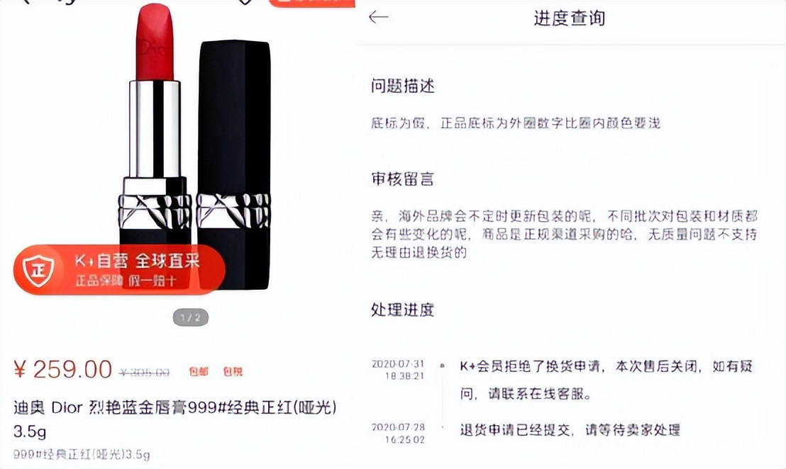 2020年12月15日,東莞市監局收到迪奧品牌方的《鑑定報告及價格證明》,顯示鑑定結果為贗品,小王和其餘消費者無不感到怒火中燒,説好的“正品保障,假一賠十”呢?