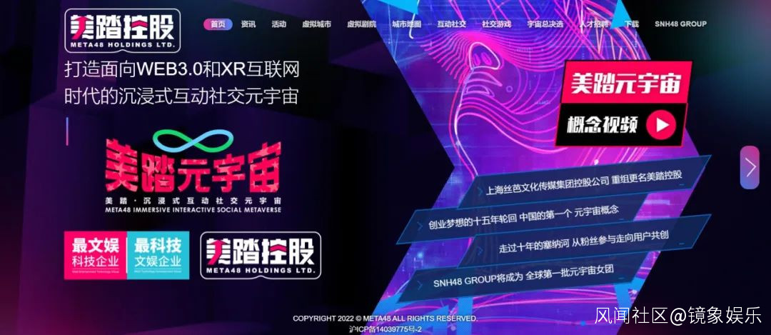 6月10日,國內偶像女團SNH48 GROUP的運營方絲芭傳媒宣佈重組核心業務和企業構架,其控股公司也更名為美踏控股,核心業務也將轉型為面向WEB3.0和XR互聯網時代的沉浸式互動社交元宇宙——美踏元宇宙。