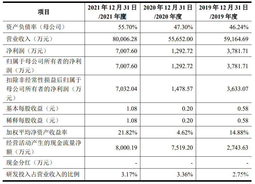 2019年至2021年,艾芬達實現營業收入分別為5.92億元、5.57億元、8億元;同期實現歸屬於母公司所有者的淨利潤分別為3781.71萬元、1292.72 萬元、7007.6萬元。