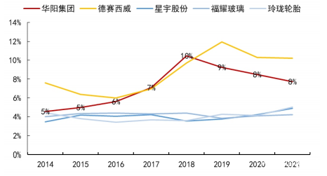 對比車燈、玻璃、輪胎等傳統汽車零部件可以發現,汽車電子對研發要求更高,可以看到德賽西威、華陽集團等電子供應商的研發費用率明顯高於其他細分領域的龍頭。疊加最近幾年智能座艙和自動駕駛的高速發展,汽車電子龍頭的研發費用率水漲船高,還在進一步提升。
