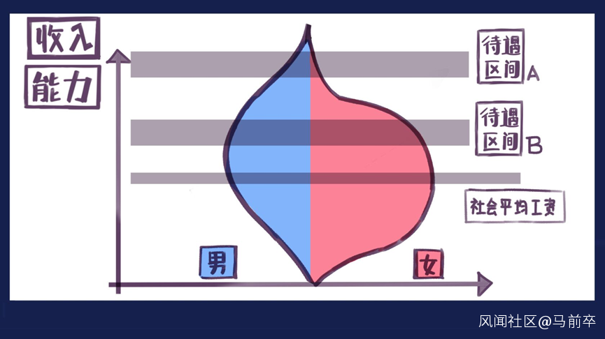 考慮到左右兩邊的面積基本相等,這意味着從上往下看,在中間偏上的部分,女性人羣變寬的速度超過男性。如果我們在較高的A處設置待遇區間,僱傭的人羣肯定是男性比例高。而如果把待遇區間挪到B處,僱傭的人羣就是女性比例高了。所以説,在小學教師工資高於平均水平的前提下,降低待遇區間,會明顯增加女性教師的比例。