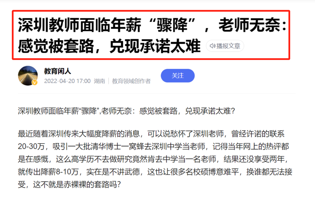 我的確主張提高教師待遇,但我希望是能夠普遍提升,更重視小學和初中階段,不要把錢都堆積在距離高考最近的高中階段。但即便是深圳的名牌高中招名校博士,我也不反對,我只是希望待遇更透明。最近的新聞恰好證明我當時的評價是正確的。