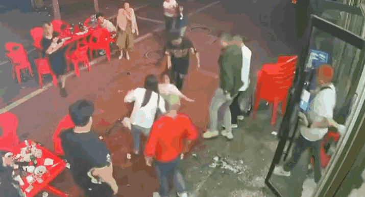 兩個人不知因為何事,發生爭執,女人生氣地往前走。就在這時,男人突然從背後襲擊女人,加速度快跑,一腳狠狠地把女人踹倒在地。然後,男人把女人摁在地上,狠狠地毆打,後面又跑來4個男人。被打女生不斷髮出哭喊聲。忙活到凌晨三點多,本來坐在店門口吃飯的夜宵店老闆一家,聽見了女生的求救。好心的店老闆,沒有猶豫,趕緊衝上去。結果,打人的一幫男人,開始羣毆店老闆。