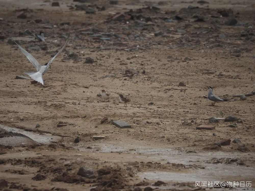 除了捕食者之外,營地面巢的普通燕鷗經常會受到天災的影響。當出現暴風雨或者由暴風雨引發的洪水時,普通燕鷗的卵和不會飛的雛鳥常常會被水沖走或淹死,導致“團滅”。某年夏天我在東營做鳥類調查時,就曾發現,一場半個小時的暴雨後,地面上的白額燕鷗(S. albifrons)等鳥類的卵被水流衝得七零八落,有些被衝到積水裏“泡湯”了,這基本上就宣告了繁殖的失敗。