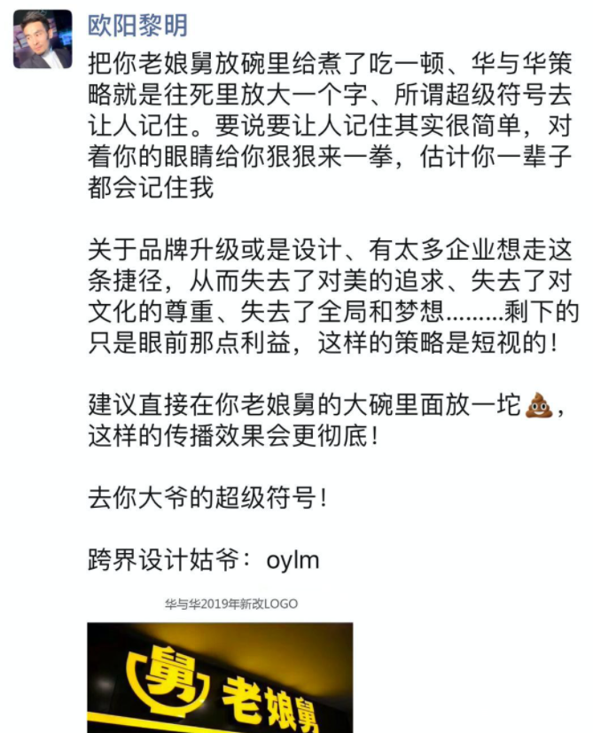 2019年3月14日,一位知名設計師歐陽黎明在自己的微信朋友圈大罵華與華,猛烈抨擊華杉給餐飲品牌“老孃舅”新設計的品牌符號。