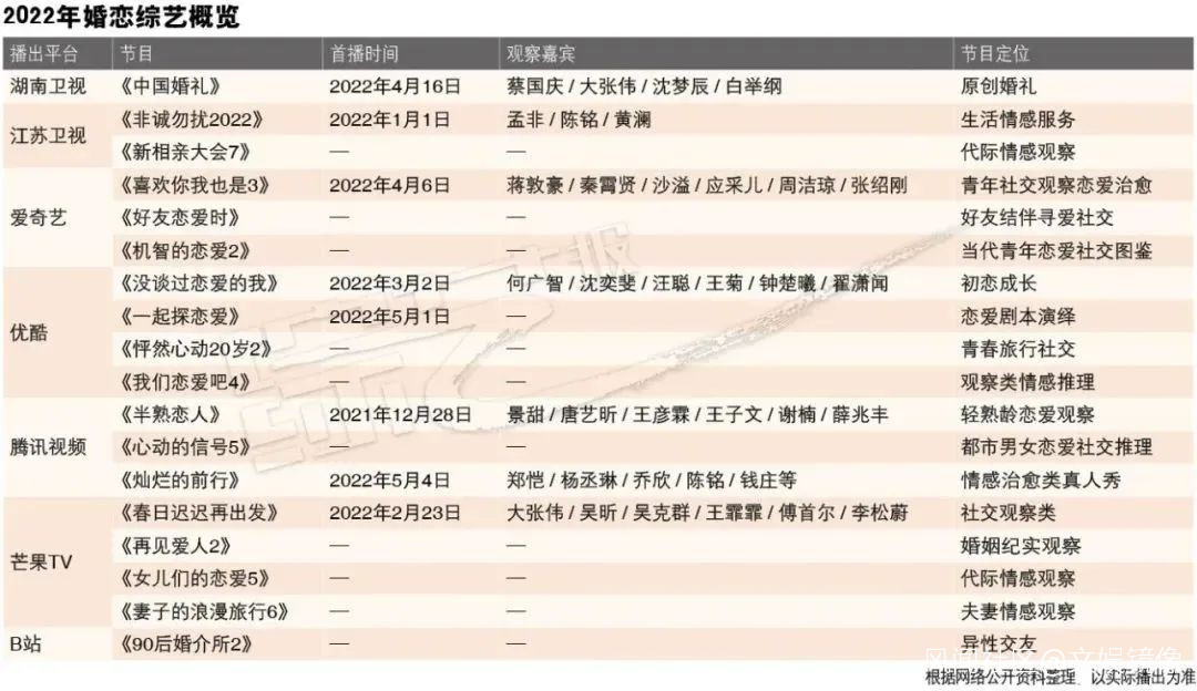 毫無疑問,戀綜已經成為音樂綜藝之後最受關注的綜藝類型,《綜藝報》梳理各平台2022片單,婚戀綜藝多達18部。