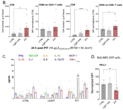 與未經治療的對照組相比,用 ZEGFR : 03115-IR700 治療的小鼠 CD4+ 和 CD8+ 免疫細胞水平更高,腦掃描也顯示出腫瘤細胞死亡的明顯跡象,而且該化合物導致殘餘腫瘤細胞被根除。