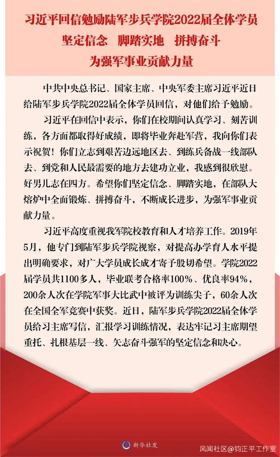 近日,習主席給陸軍步兵學院2022屆全體學員回信,高度肯定他們紮根基層一線、矢志奮鬥強軍的堅定信念和遠大志向,勉勵他們在部隊大熔爐中全面鍛鍊、拼搏奮鬥,不斷成長進步,為強軍事業貢獻力量。