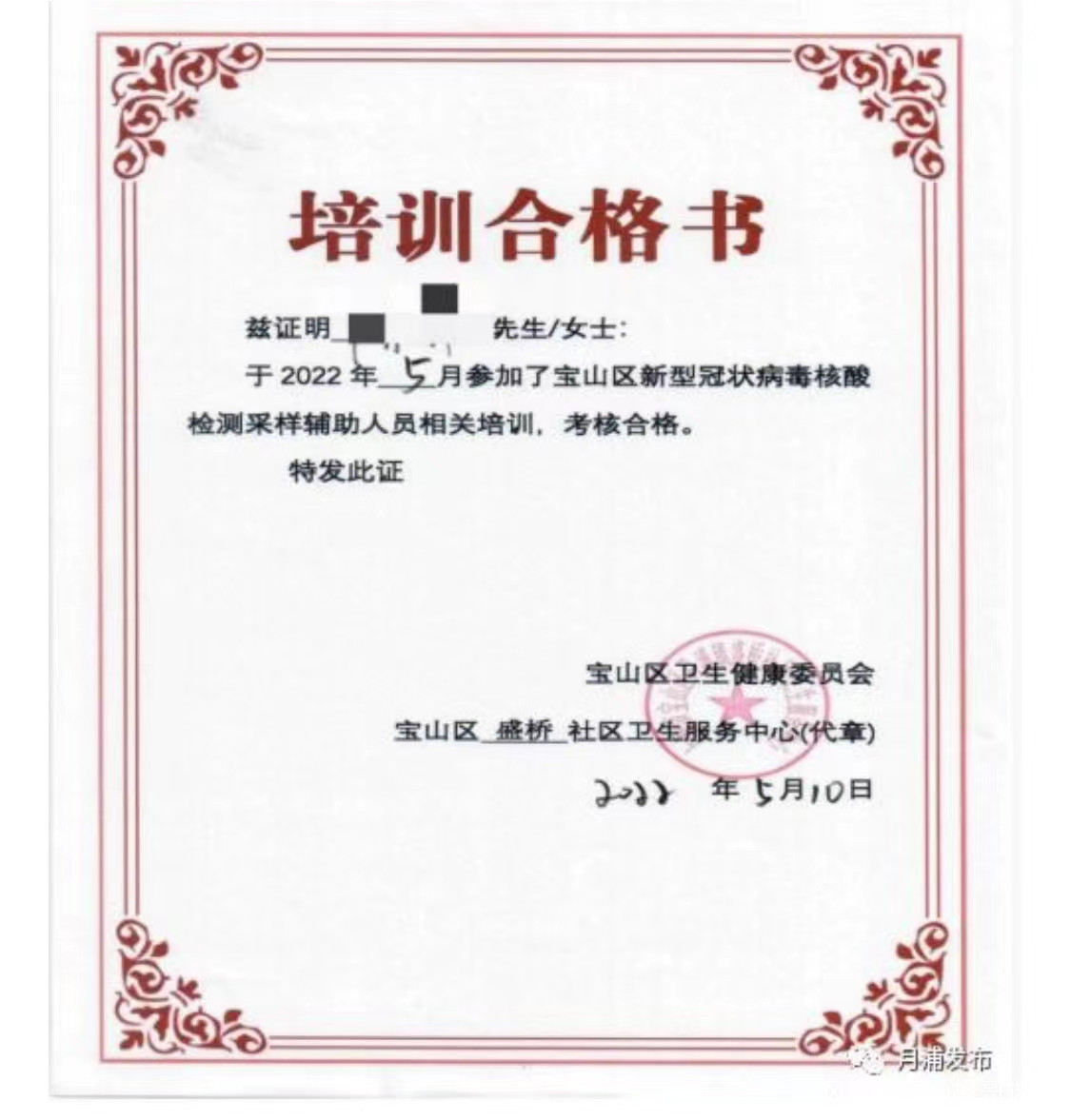 今年5月1日寶山區下發一則通知,在核酸採樣點工作人員前期報名工作結束後,由區衞健委舉行線上考核,線上考核合格人員,再參加線下技能考核。5月15日,上海寶山公眾號發表“一批核酸檢測採樣輔助人員正式上崗”的文章。文章稱,5月13日月浦鎮已經有132名核酸檢測採樣輔助人員持證上崗,完成採樣近6萬人次。與文章同時配發的還有一張由寶山區衞生健康委員會出具的“培訓合格書”。上面寫着:“XX於2022年5月參加了寶山區新型冠狀病毒核酸檢測採樣輔助人員培訓,考核合格,特發此證。”