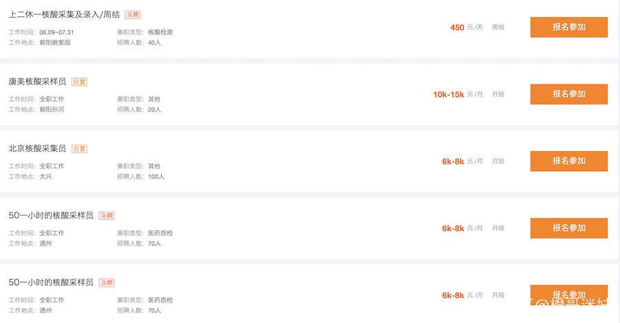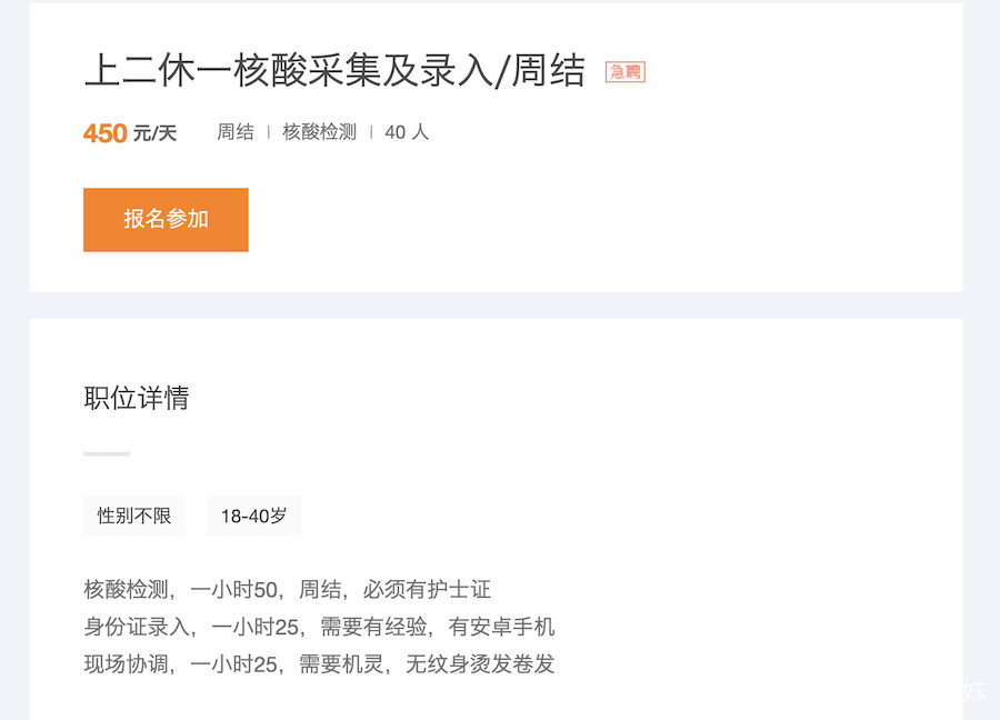 另據第一財經記者瞭解,負責招聘採樣員的中介並非都是“正規軍”。“我們都是從網上各種渠道看到招聘信息的,有招聘網站、有抖音或者朋友圈。”採樣員王明告訴第一財經記者,“中介不一樣,給到的工資也不一樣,工資多少都是中介定的。”