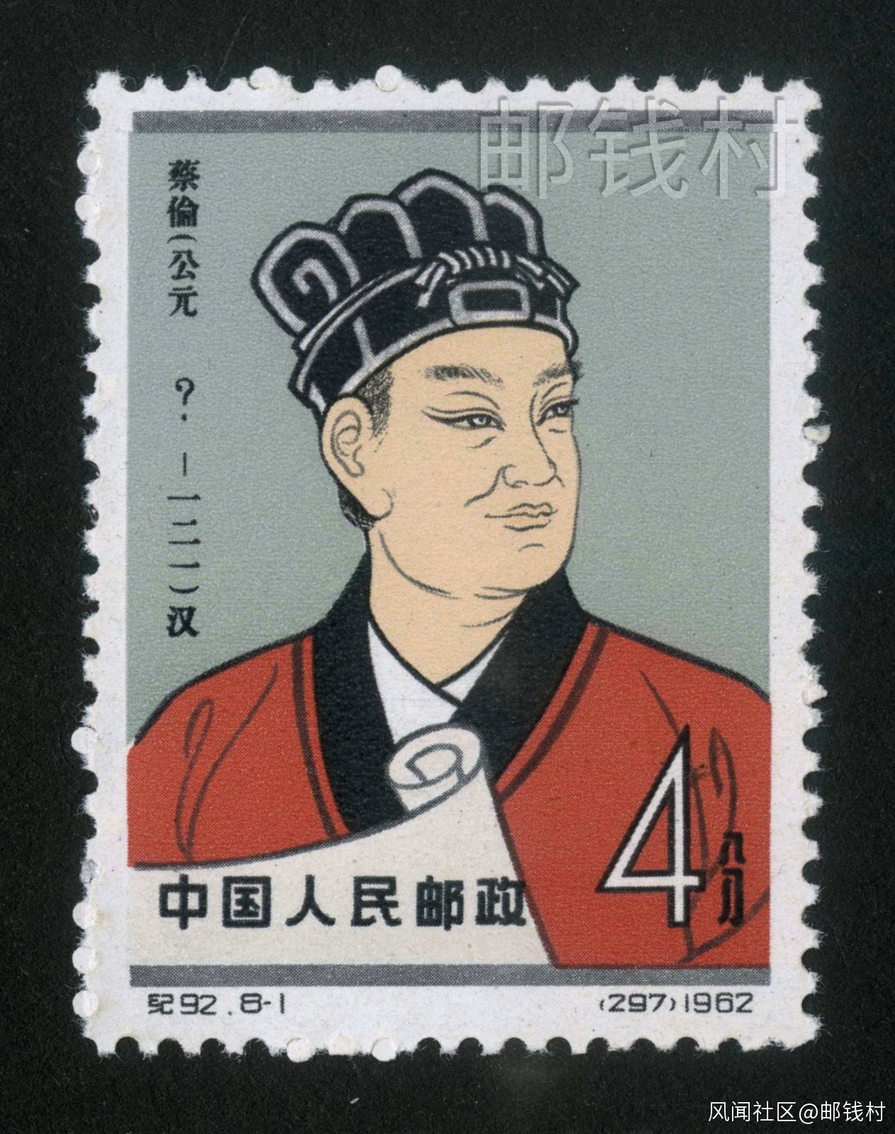 1962年12月1日發行的郵票上由於蔡倫出生年代不可考,故在“公元”之後打了一個問號,但在製版時卻成了“公元前?”,在印刷時又漏颳了全版中的一枚,以致出現一枚有“前”字的錯票。由於錯票混在全版50枚之中,一時難以發現,等發現通知收回時,已有部分售出。出售時才被一些幸運的集郵者意外地發現。郵票發行部門將錯體票收回,約有數枚流出,十分珍貴。現在這枚“蔡倫”郵票,雖然名氣不如“片紅”,但也是以錯版搏出位,價格不菲。