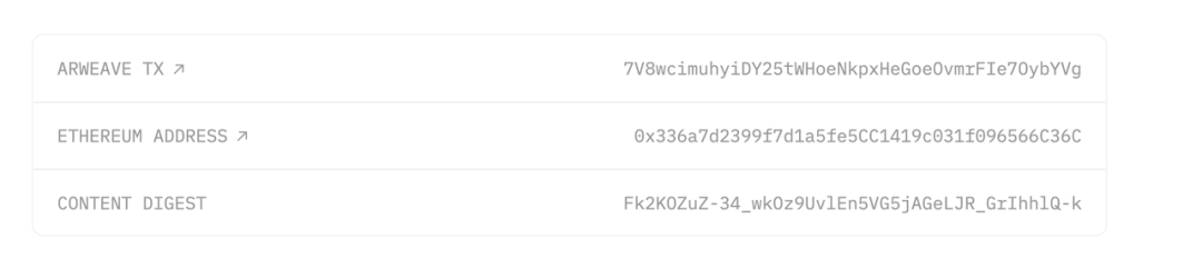 文章發佈後會有「Arweave 交易 ID」、「貢獻者以太坊地址」和「內容摘要」三個信息出現