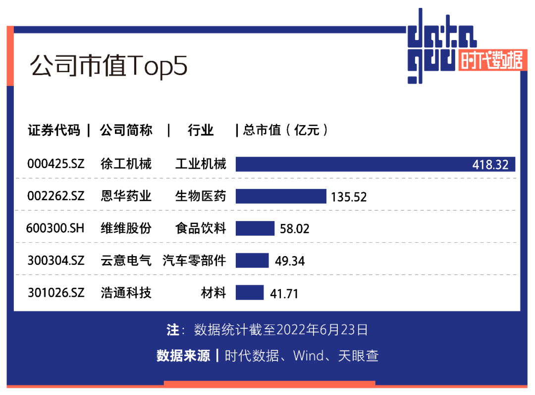 **據時代數據統計,截至2022年6月23日,一共有2家公司市值超過100億元。**其中,徐工機械(000425)市值達到418.32億元,排在第一;恩華藥業(002262)市值135.52億元,排在第二。