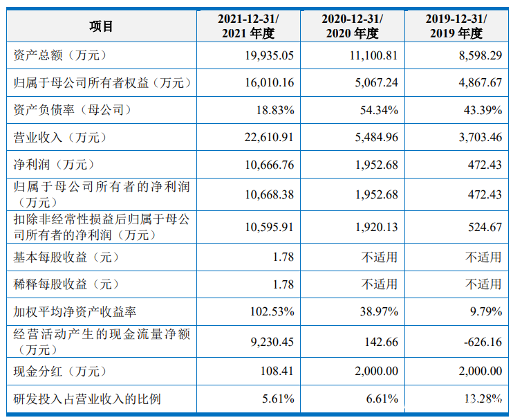 財務數據顯示,公司2019年、2020年、2021年營收分別為3703.46萬元、5484.96萬元、2.26億元;同期對應的歸母淨利潤分別為472.43萬元、1,952.68萬元、1.07億元。