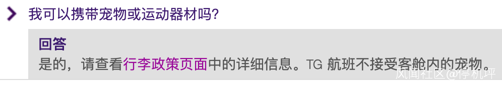 而在行李政策頁面中也做出了進一步説明:僅部分目的地可接受狗或貓作為行李託運,且應遵循相關國家的具體規定。