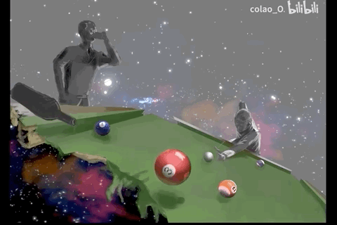 第五次,黑球以接近光速的速度飛出,把枱球桌沿撞出一個缺口,擊穿了牆壁,然後飛出地球,飛出太陽系。”