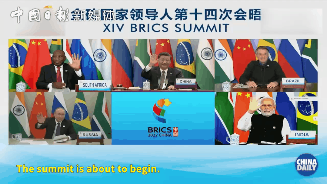 ▲2022年6月23日,金磚國家領導人第十四次會晤以視頻方式舉行,五國領導人在大屏幕上“雲合影”。