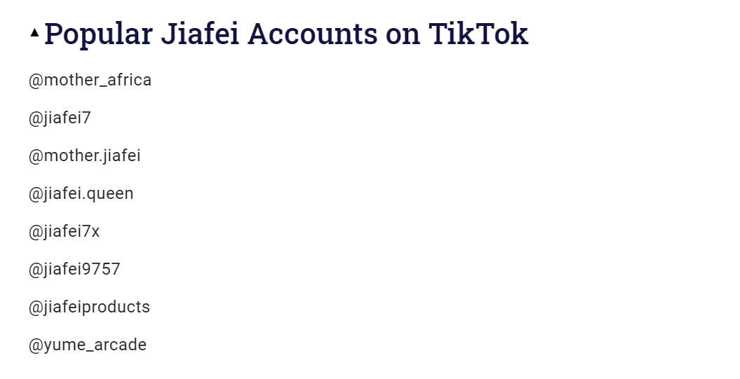 **但去年,這些帶貨營銷號視頻,突然被批量註冊成“ 殭屍賬號 ”,**並在 ID 中都加一個“ jiafei ”字樣,一股腦進軍到了國外的 Tik Tok 上。