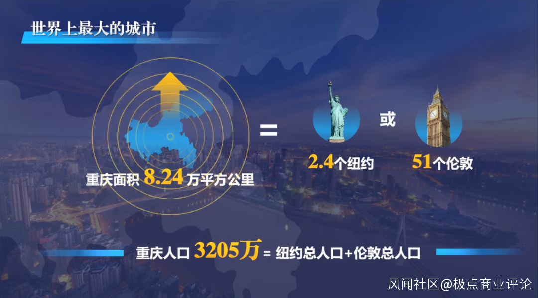 眾多人口、遼闊地理,則為重慶提供了許多可被挖掘的縱深空間。國家統計局“七普”公佈結果中,重慶被帶上“世界最大城市”桂冠:人口3205萬,相當於紐約與倫敦人口總和;城市面積8.24萬平方公里,相當於2.4個紐約、51個倫敦——儘管這一桂冠有所爭議,但作為城市競爭盡頭,人口數量足矣它強大的“battle”(競爭)力。