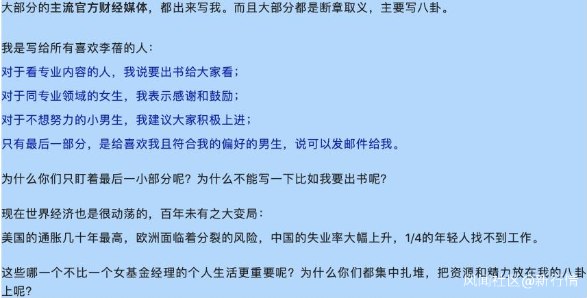 她表示,現在世界經濟動盪,百年未有之大變局……哪一個不比一個女基金經理的個人生活更重要呢?“為什麼你們都集中扎堆,把資源和精力放在我的八卦上呢?”