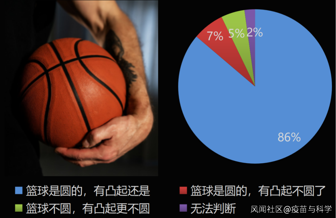 結果“籃球是圓的,有凸起還是”佔85%,“籃球是圓的,有凸起就不圓了”佔7%,“籃球不圓,有凸起更不圓”佔5%,剩餘2%無法判斷。