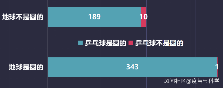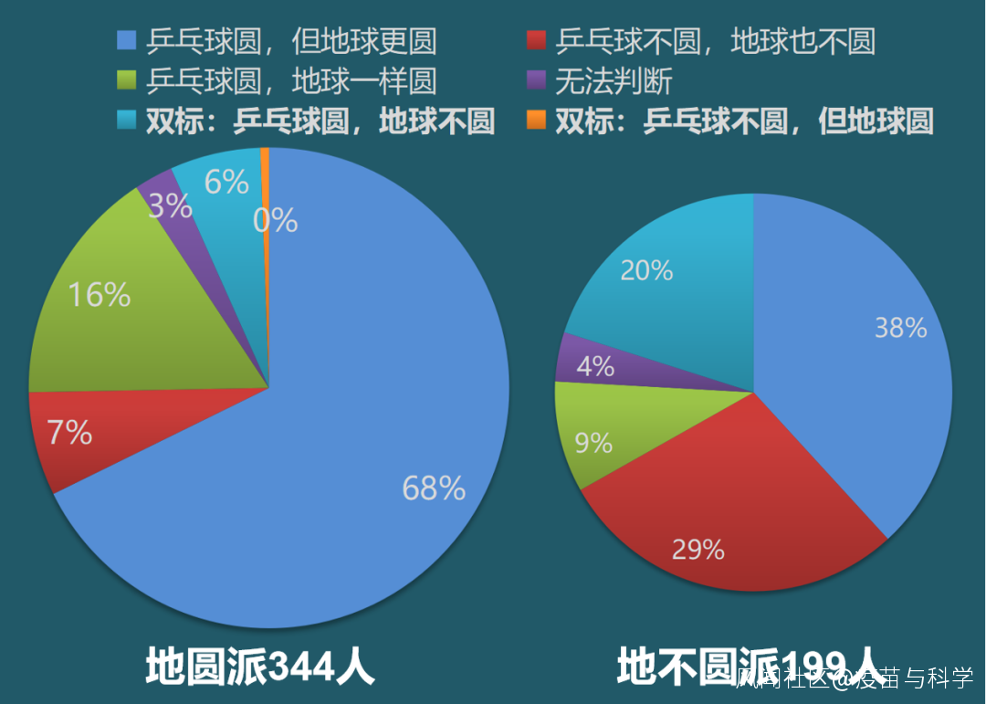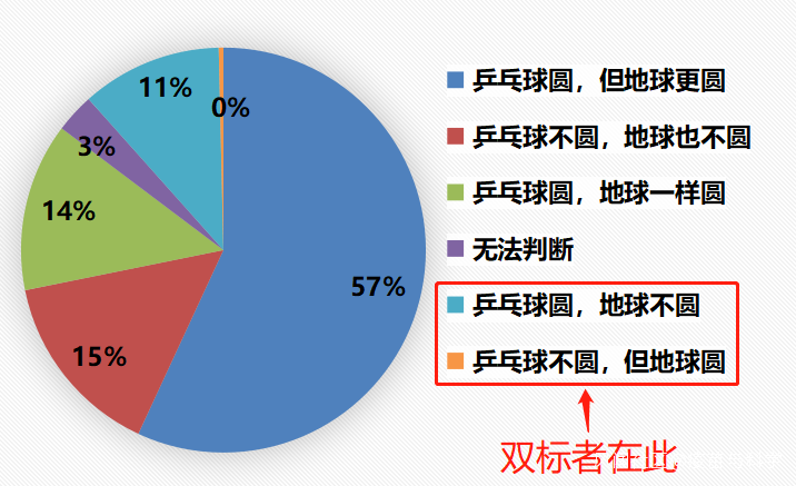 地圓派344人中,只有21人認為“乒乓球圓,地球不圓”,2人選擇“乒乓球不圓,但地球圓”,雙標者濃度是6%。