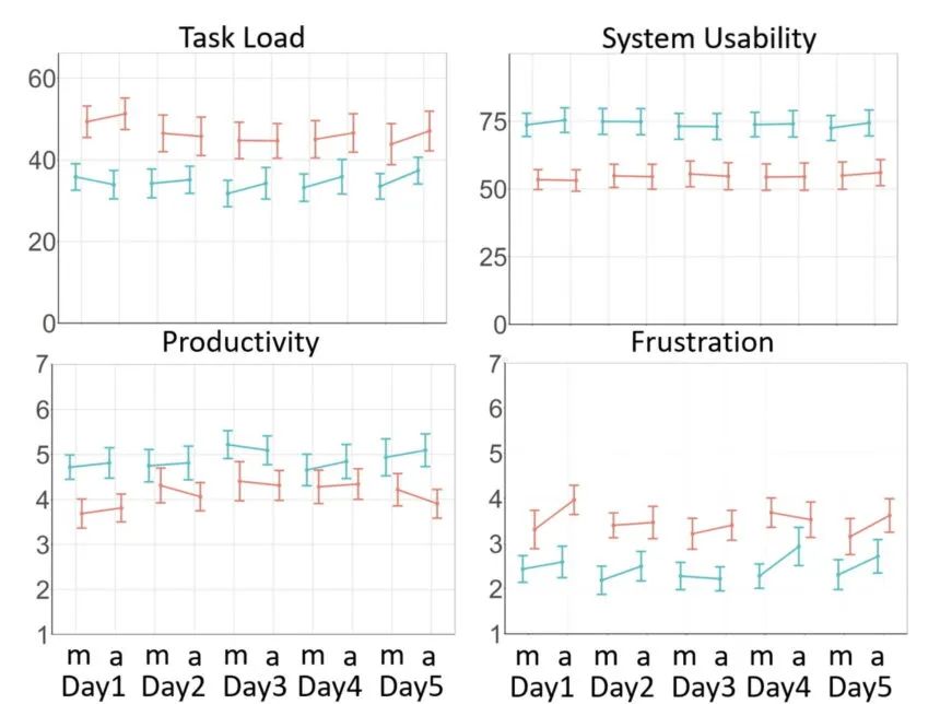 一週之後,團隊得出實驗結果,不論是從工作量、系統可用性、工作產出還是挫敗感來説,VR 環境的成績都比物理環境要低。同時,在 VR 中工作帶來的挫敗感更大,更容易產生不適和焦慮,更不用提視覺疲勞要比物理環境大得多。