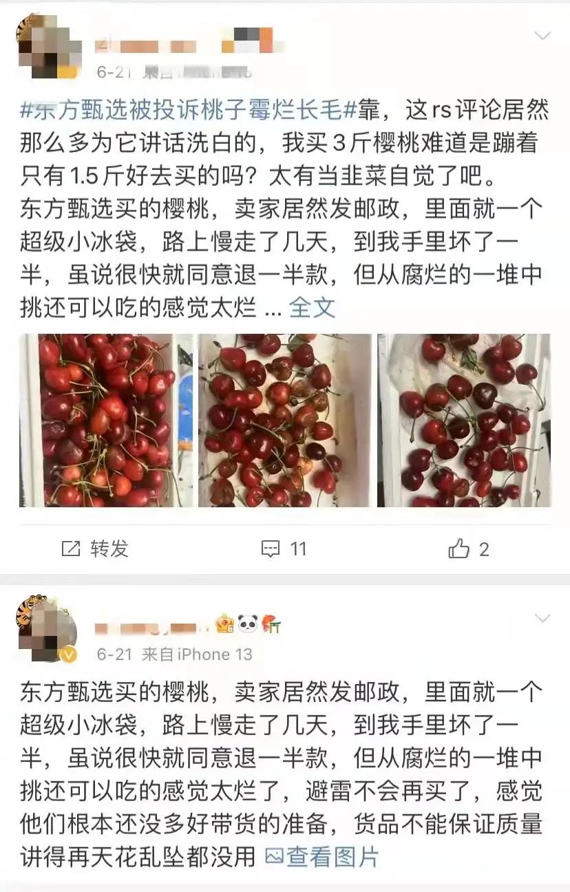 6月15日,有消費者反應在東方甄選直播間買到的水蜜桃出現變質,雖然東方甄選已經及時退款給消費者,但是依然未能止住外界的熱議,有消費者爆料還曾買到過變質的櫻桃。黑貓投訴上也出現了投訴“在東方甄選買到的農產品變質”的案例。