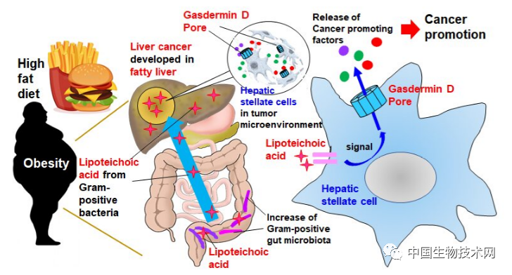 IL-1β是細胞因子級聯的上游調節因子,在肝細胞癌發展中發揮着重要作用。IL-33在肥胖相關肝臟腫瘤微環境中的衰老造血幹細胞中被上調,並被牛糜蛋白酶彈性蛋白酶家族成員1(CELA1)裂解。由於高脂肪飲食導致腸道屏障功能障礙,脂磷壁酸在肥胖小鼠的肝臟中高度累積,從而誘導衰老的肝星狀細胞刺激Gasdermin D蛋白(GSDMD)裂解,然後通過半胱氨酸天冬氨酸蛋白酶-11(Caspase-11)切割GSDMD末端形成的細胞膜孔釋放出活性的IL-1β和IL-33。