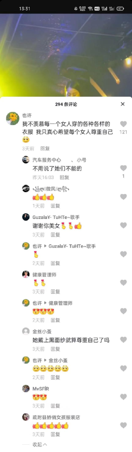 也許一些人會開始説:“這只是網絡上的少部分人,不要因為這些就加以罪名。”筆者就想問:怎麼?難道網絡就是法外之地,在網絡上就可以這樣“隨心所欲”了?就因為穿個短裙、吊帶,跳了段熱舞在你們眼中就不配為母親、不配為女人,真的想問問是誰給你們的自信隨便給女人加頭銜、扣帽子?隨隨便便的一句“這就是未來的母親”、“這就是我們民族的女人”……就開始對她們進行道德綁架、人格評判,是誰決定必須是母親,又是誰要求我要成為什麼樣的女人?也許有些人會説:那只是在網絡上。筆者想説:正是因為在網絡上已經猖狂到這種地步,只是簡單地走個秀都要被指指點點,難道在現實生活中這些就不會照映?我想並非如此。