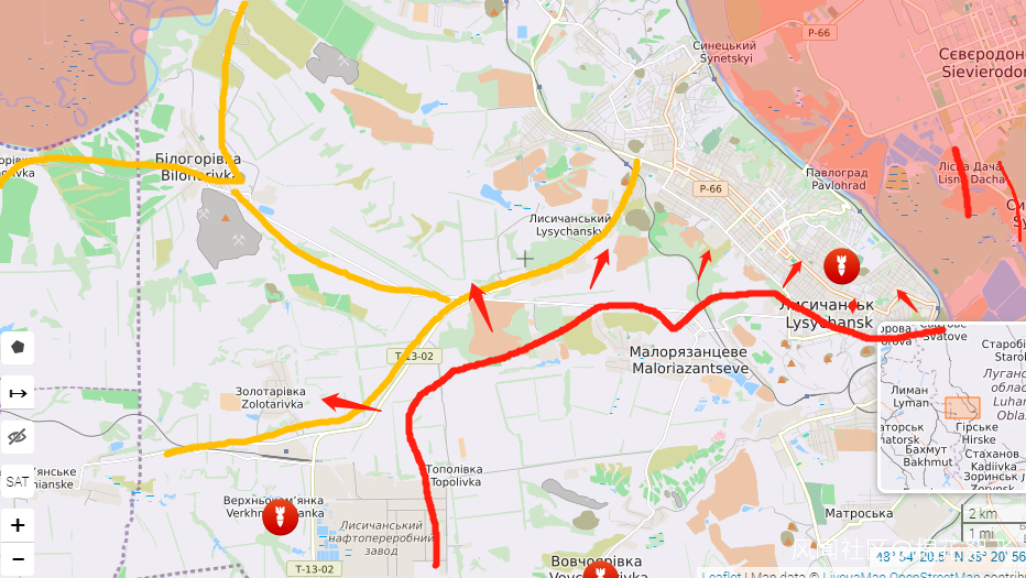 5、波帕斯納方向,俄羅斯沒有進入利西昌斯克煉油廠,裏面情況不明,煉油廠附近的2個村莊都已經被俄羅斯拿下,目前俄羅斯已經事實上控制了北側補給線。俄羅斯直接從煉油廠附近攻入了市區,同時南線也攻入了工業區,真的以為是包圍再突擊巷戰,根據前線報導是因為前線查到部分司機辦公室人員到達了利西昌斯克,俄羅斯準備俘虜他們,所以把斯拉維楊斯克方向的一部分軍隊、阿瓦迪夫卡的海軍陸戰隊,還有第1軍調過來,在沒包圍的情況下就發起了突擊,根據前線報導,俄羅斯的進展還是很不錯,5個方向同時向心攻擊,西南部已經進入了市區,並擴展。南部的工業區已經拿下了3分之一,裏面烏軍還是一部分頑強抵抗,一部分已經潰逃,一部分躲了起來準備等待投降。在利西昌斯克往塞弗爾斯克的死亡公里,烏軍80空降旅逃跑的損失率估計就40%後俄羅斯增加了直升機和轟炸機對這條道路及附近的轟炸。裏面的烏軍剩餘留守的兵力在6000多人,已經跑了5000多人,估計俄羅斯打獵戰果也不錯。利西昌斯克其北側還有條小路可以撤離,同時烏軍可以跟澤勒特一樣選擇在田野裏狂奔,也是個辦法。目前俄羅斯集中的兵力大致有2萬多,直接開始了攻城。前線配置了大量火炮和攻城利器。拿下利西昌斯克的意義棉花絮之前反覆強調,鐵路、公里樞紐。所以肯定需要優先儘快拿下。由於M3公里推進需要經過斯拉維楊斯克,比較難打,所以利西昌斯克附近的高速及鐵路對俄羅斯的補給是相當需要的,黃線是公里,黑線是鐵路。