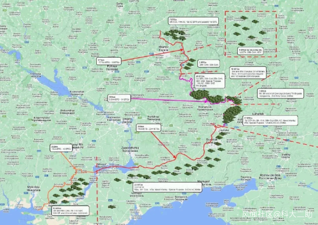 烏克蘭方面發佈了目前俄羅斯軍隊在烏克蘭和頓巴斯的最新集結地圖。可見俄軍把三分之二的部隊集中於頓巴斯戰線。烏方認為俄軍在東部和南部前線集結了大約100個營級戰術羣(BTG),其中以頓巴斯前線的部隊密度最高,在300公里的戰線上部署了54個BTG,平均每5.6公里就部署一個BTG,相當於齊頭並進了。